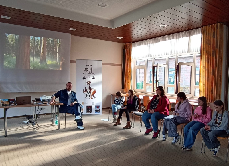Am Donnerstag, den 30. Oktober 2025, besuchte die Bücherei-AG der Schule gemeinsam mit ihrer Leiterin Frau von Häfen eine besondere Lesung in der Begegnungsstätte in Dinklage: Der Autor und Illustrator Thomas Forat stellte dort seine Buchreihe „ARVIL – Der kleine Falke“ vor.