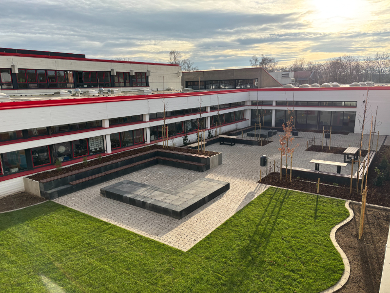 Der große Innenhof der Oberschule ist nach umfassender Umgestaltung fertiggestellt und wurde nun nach den Weihnachtsferien offiziell freigegeben. Den Schülerinnen und Schülern der Jahrgänge 9 und 10 steht damit ein neu gestalteter Aufenthaltsbereich zur Verfügung, den sie künftig in den großen Pausen nutzen dürfen. Der modernisierte Innenhof soll nicht nur ein Ort der Erholung sein, sondern auch als schulischer Veranstaltungsort im Freien genutzt werden. In Absprache mit der Schülersprecherin Madlin Omer wurde ein rollierendes System für den Ordnungs- und Pflegedienst vereinbart. Die Klassen der Jahrgänge 9 und 10 übernehmen dabei abwechselnd die Verantwortung für Sauberkeit und Ordnung im Innenhof. So leisten die Schülerinnen und Schüler einen aktiven Beitrag zum Erhalt des neu gestalteten Innenhofs, wodurch die Verantwortung für den gemeinsamen Schulraum gestärkt wird. In 2026 wird auch der kleine Innenhof in die Ausschreibung gehen und in Zukunft als „grünes Klassenzimmer“ für alle Klassen nutzbar sein.