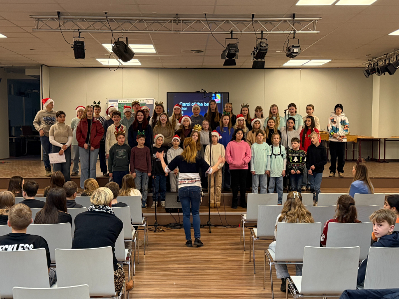 Am 19. Dezember verwandelte sich unsere Schule in einen stimmungsvollen Ort voller Musik, Gemeinschaft und vorweihnachtlicher Freude. Den festlichen Auftakt gestalteten Orchester und Chor mit dem schwungvollen Klassiker „Rudolph, the red-nosed reindeer“, der sofort für gute Laune sorgte. In seiner Eröffnungsrede stimmte Schulleiter Stefan Fiebig die Schulgemeinschaft auf die besondere Zeit ein und dankte allen Beteiligten für ihr Engagement. Das abwechslungsreiche Programm zeigte eindrucksvoll die Vielfalt unserer Schule: Die Klasse 5b von Frau Abeln begeisterte mit dem Sprechstück „Es ist Advent“, das durch Body Percussion lebendig wurde. Die 5c von Frau Rolf lud mit einem unterhaltsamen Weihnachtsquiz zum Mitraten ein, während die 5d von Frau Blömer das Gedicht „Die Weihnachtsmaus“ vortrug. Musikalische Höhepunkte setzten die 6a unter der Leitung von Frau Lücking mit dem Stück „In der Halle des Bergkönigs“, welches die Schülerinnen und Schüler mit Glockenspielen und Xylophonen interpretierten. Die 7c von Frau Lampe trug das Gedicht „Schön ist’s in der Weihnachtszeit“ vor. International wurde es mit dem WPK Französisch des Jahrgangs 7, der „Hört der Engel helle“ auf Französisch präsentierte. Zwischendurch bereicherten immer wieder der Chor unter der Leitung von Frau Lücking mit Stücken wie „Carol of the Bells“ und „He’s alive“ (einem Weihnachts-Rap) sowie das Orchester unter der Leitung von Herrn Lier mit Klassikern wie „Alle Jahre wieder“ und „Jingle Bells“ das Programm. Ab 11 Uhr versammelte sich die gesamte Schulgemeinde zum gemeinsamen Singen, zu Danksagungen und zum stimmungsvollen Abschluss. Als fröhlicher „Rausschmeißer“ erklang schließlich „Last Christmas“ – ein gemeinsamer Moment, der schon zur Tradition der Weihnachtsfeier gehört. Ein herzliches Dankeschön an alle Mitwirkenden, Lehrkräfte und Helfenden für diese gelungene Feier!